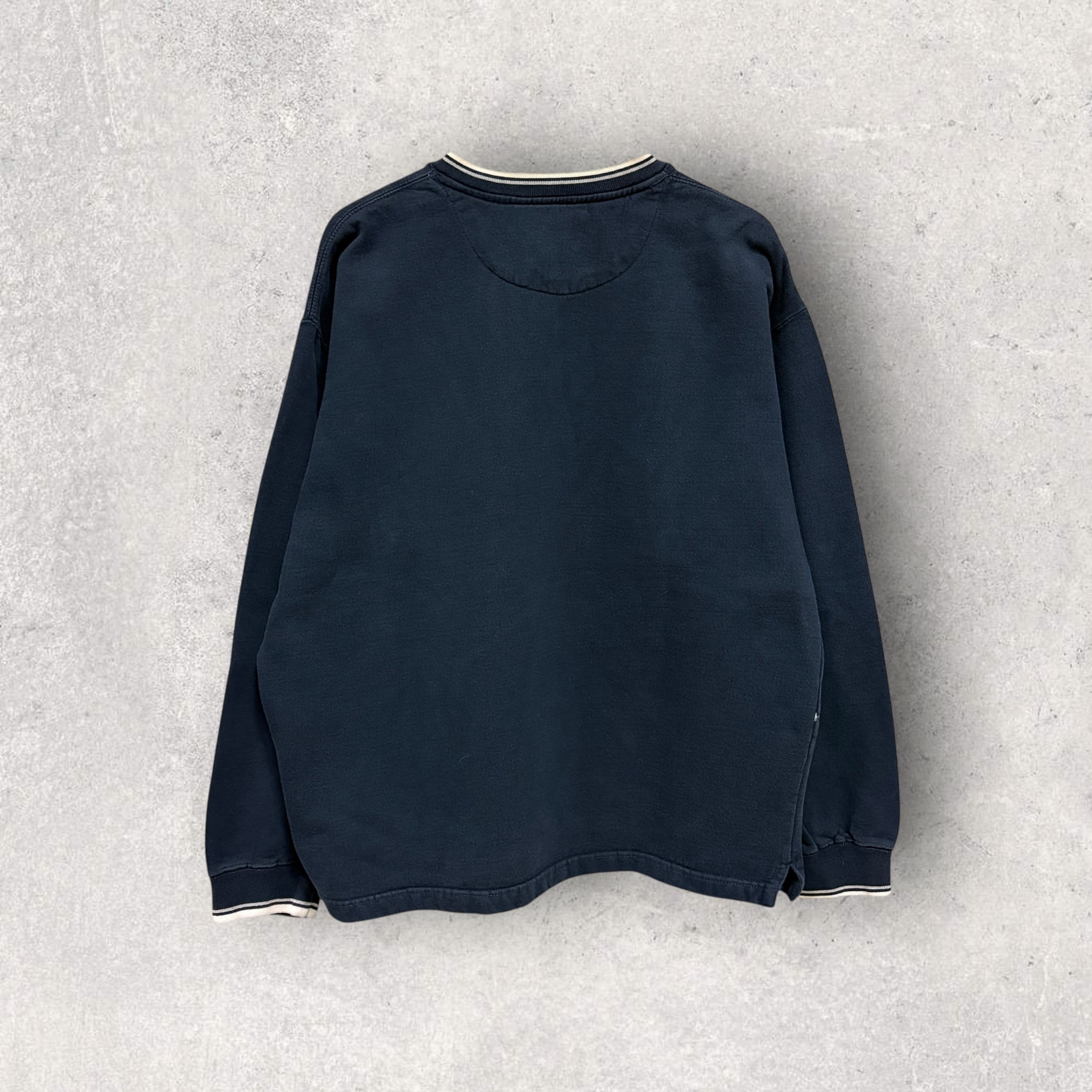 右袖にやや汚れあります。全体的にフェードしたネイビーカラーになります。特に目立った傷や汚れはありません。
