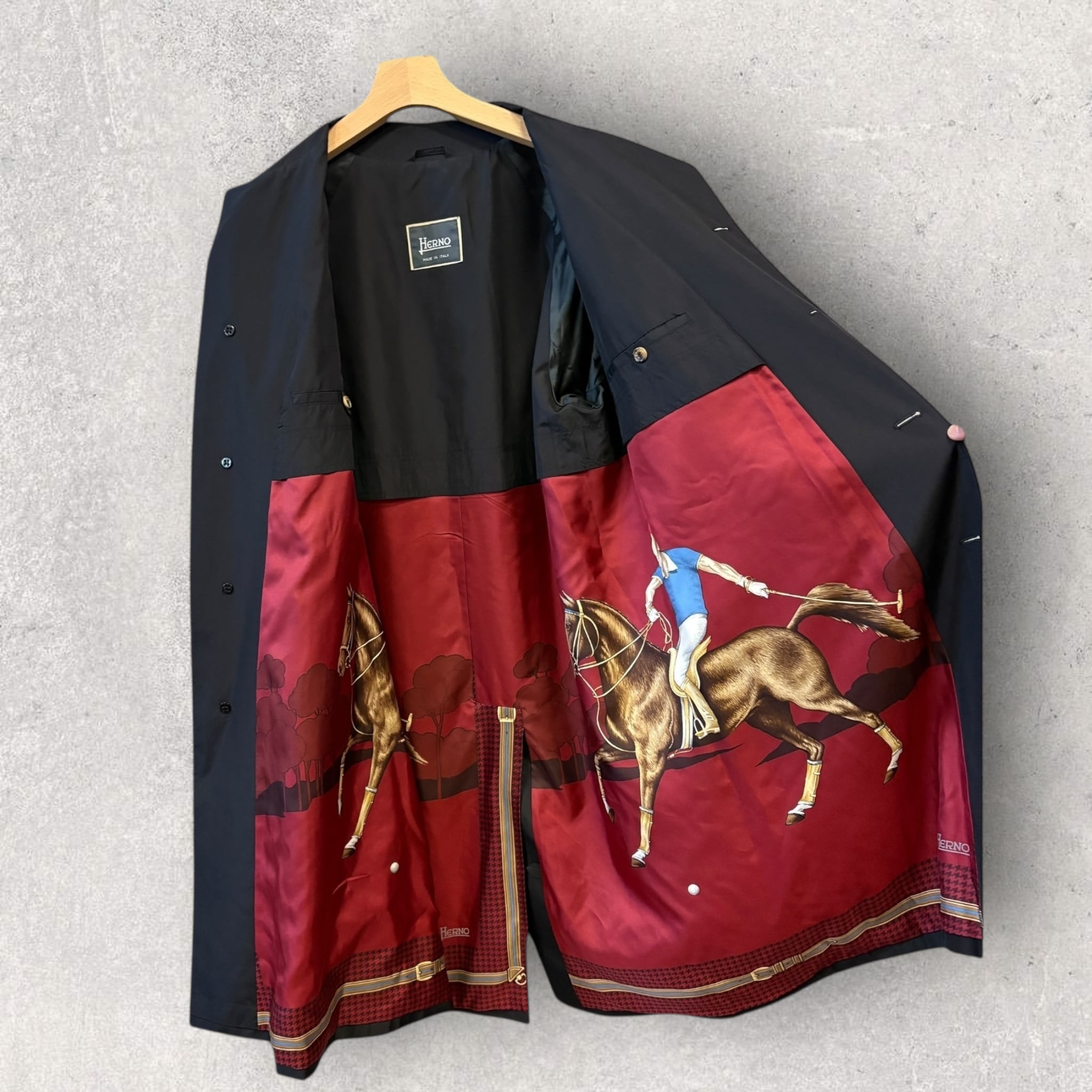 馬と騎手プリント ブラックロングコート